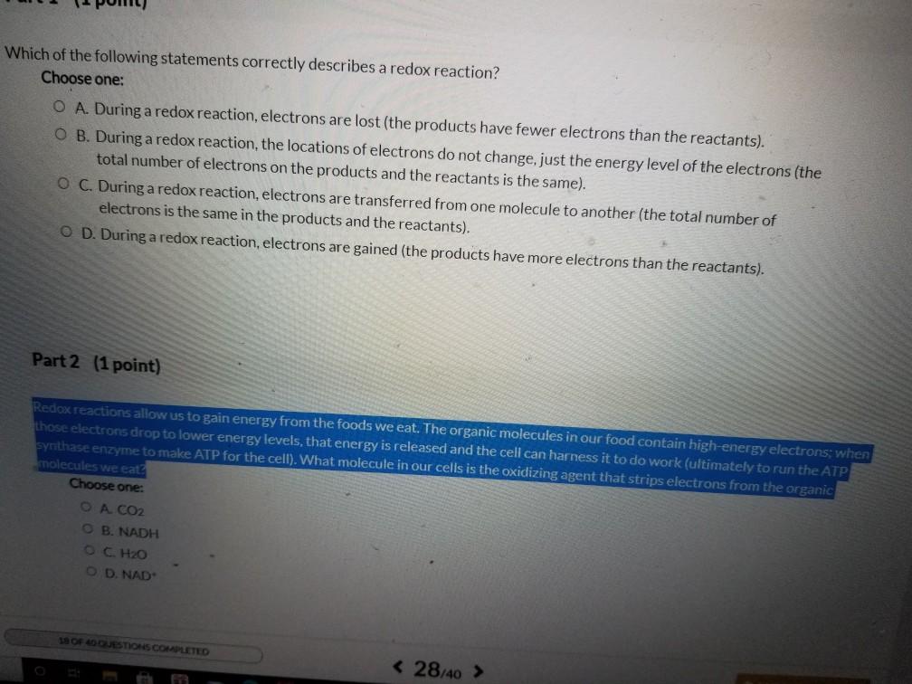 Question 2 2 points Which of the following statements describes what happens to a molecule that functions as the reducing agent electron donor in a redox or oxidation-reduction reaction. It gains electrons and loses potential energy C. Determining whether a reaction is a redox reaction or a non-redox reaction.