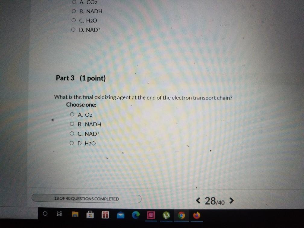Which of the following statements describes what happens to a molecule that functions as the oxidizing agent electron acceptor in a redox or oxidation-reduction reaction. B It gains electrons and loses potential energy. 1 Which statement best describes what is taking place in this half reaction Fe.